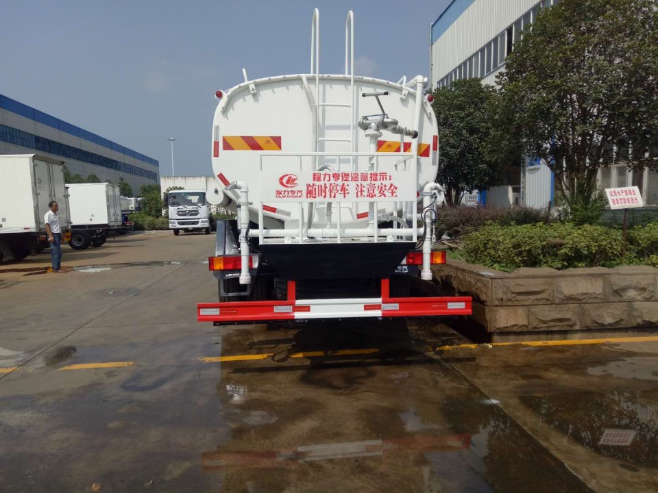 上裝配置:罐體采用5mm厚武鋼集團供應的罐車專用板材制作,容積:20立方;罐內3道防浪隔板具有防波作用,減低罐內液體的沖擊。配備國內大功率灑水車專用水泵,可自吸自排,引水時間<15min,流量60m3/h,揚程90米。東風天龍灑水車其它專用部分標配為:前沖、后灑、側噴、后工作平臺、360度可調節綠化水炮,水泵垂直吸程≧7米,前沖灑水寬度≧16米,綠化水炮射程≧35米,自流閥、濾網、消防接口(可連接消防栓取水,可作應急消防用)。罐前量管(觀察罐內水位)、罐后爬梯、罐上罐口帶簡易護欄、罐側雙炮筒、6米長4寸鋼絲塑膠管兩根,罐體表面雙層油漆工藝,防銹、耐腐蝕,其余有廠家標配。可選擇加裝加裝藥盤、氣動控制閥、噴藥設備、罐內防腐等。