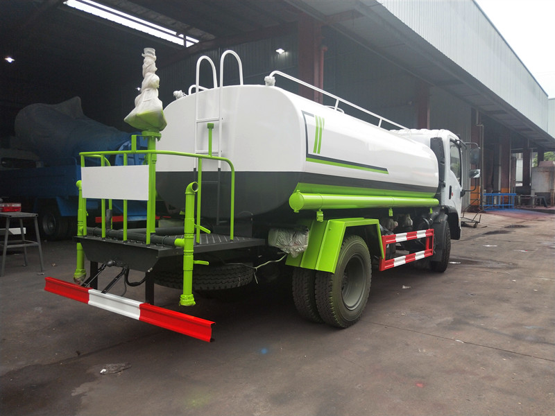 灑水車 罐體容積為5立方灑水車,新款工藝罐體,厚度為4mm碳鋼Q235材質,罐內隔板具有防波作用,以減輕汽車行駛時罐體液體沖擊,罐體及整車外形尺寸按照公告。帶大功率專用灑水泵,泵可自吸自排,整車前沖、后灑、側噴、帶65消防接口,后平臺帶綠化灑水炮,灑水炮可全方位旋轉,可連續調成直沖狀、大雨、小雨、毛毛雨;前封頭帶水位計,后平臺主管路帶1寸澆花接口,后爬梯。平臺后部帶小安全告知牌:“隨時停車,注意安全”,帶兩根水管及陰陽端。罐體顏色:上白/下藍,銀灰/銀藍,罐體兩側噴“灑水車、綠化灑水車”字樣,貼反光標示。灑水車可加裝前沖后灑氣動閥駕駛室控制、可加裝霧炮機組發電機組噴霧降塵裝置、車頭可加裝推雪雪鏟、雪滾裝置街道、公路除雪等。