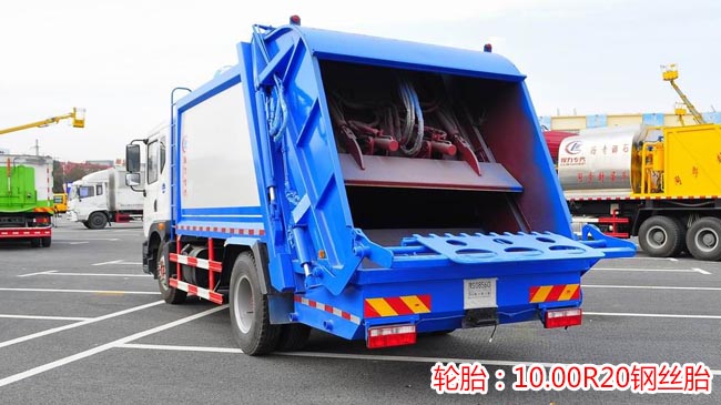上裝配置:新款無筋條箱體,平面圓弧美觀大方,有效壓縮容積12方或14立方,尾部帶翻轉上料機構,電控手動雙操控器,駕駛室與車尾部雙控制箱,尾部帶3厘米厚橡膠密封壓條,帶污水收集槽,大容量污水箱。箱體可按要求噴繪圖案和字樣。