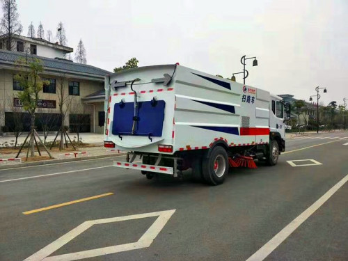 1、東風御虎國V二類底盤,駕駛室帶前翻,方向助力,7.50R鋼絲胎,配備朝柴142馬力發動機,低油耗。 2、副發動機采用性能強勁的江鈴77馬力發動機。 3、自動離合器驅動風機,減少風機啟動和停止時對發動機的沖擊。離合器在使用過程中具有高度耐磨、使用壽命長、低噪音、低油耗量和節省成本的優點。 4、采用洛陽上市公司,北玻臺信大功率耐磨免維護離心風機,無噪音,效率高風量大,使用壽命長。 5、清水箱充分利用了車載空間,容積2.5m3,內置水位報警器,水箱內部做防腐,防銹,防毒處理,使水泵運行更安全,保障了清掃的效率。 6、垃圾箱采用雙層內膽不銹鋼結構,容積5m3,內部加裝過濾網板,能有效地防止樹葉、塑料袋之類的輕飄物堵塞風口及灰塵的排出。內置噴霧壓塵裝置,最大限度的利用了垃圾箱裝載垃圾的空間。廂體采用傾翻卸料。 7、左右立掃為單掃盤,前掃盤帶自動避讓功能,減少了掃刷的數量和掃刷消耗量,能降低使用成本。掃刷上加裝噴水裝置,用于噴霧降塵。左右立掃分開控制,可實現后掃和全掃等不同的作業模式。
