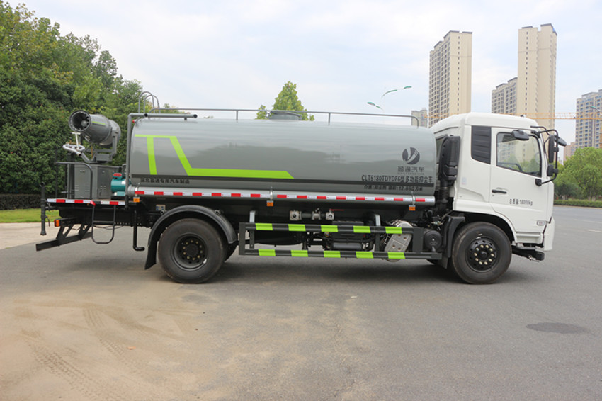 程力灑水車前裝有鴨形噴嘴或圓頭沖嘴,后面裝有圓柱開灑水噴嘴或蓮蓬頭噴嘴,后部有一工作平臺,裝配有水炮。后部還可裝8個噴嘴(選裝)。噴水器一般用于沖洗街道,起除塵和降溫作用,其噴水器可以用調節噴嘴螺紋的方法改變噴水器的噴灑方向和角度,高射水炮可以用于城鄉園林綠化及應急消防。蓮蓬嘴可以澆落路中間噴水器沖起的灰塵,起到清潔空氣的作用。