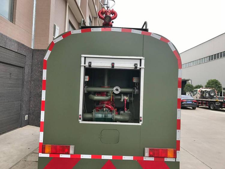 越野灑水車水罐體上裝配置:罐體采用碳鋼Q235板材,板材厚度4mm,罐體容積10-12立方,安裝全功率夾心取力器,CB10/40型消防水泵,帶PS40消防水炮一個,射程大于55米,后置工作泵箱,消防栓接口左右各一個,駕駛室頂部安裝長條警燈帶喊話器,全車顏色軍綠,兩側(cè)噴涂白色森林消防字樣。
