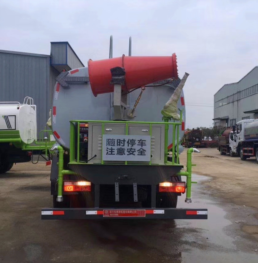 噴灑抑塵車上裝配置:罐體鋼板采用Q235碳鋼鋼材,前沖后灑、側(cè)噴、平臺(tái)高炮、自流閥及消防接頭各1個(gè)、水管2根、標(biāo)配億豐泵或金龍泵,霧炮機(jī)可選裝30-50米