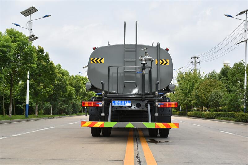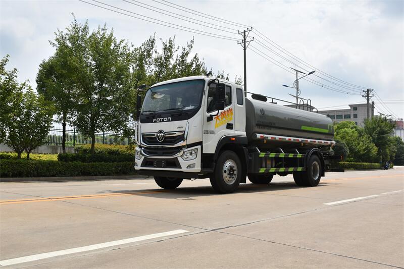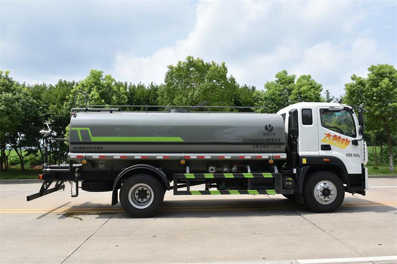 福田15噸灑水車標配前噴(鴨嘴)、后沖、后灑、側噴、后置式工作 平臺,平臺上配置綠化水炮(可 360°旋轉,既可以調成柱狀,也可 以調成霧狀,更可以調成直沖狀、大雨、中雨、小雨、毛毛雨),配 備優質大功率專用灑水泵(可自吸自排,可從河里或池塘抽水到罐體), 取力器,雜物過濾網,消防接口,自流球閥系統、取力器、球閥、濾網 均為國家標準產品,主管道加粗,法蘭墊、法蘭盤加厚,大通徑球閥。 整體具備性能優良安全可靠、效率高、流量大、維修方便等特點。 二.產品配置 1.底盤配置: 發動機玉柴 200 馬力(四缸),法士特 8 檔變速箱,軸距 4500,前 橋 4.5T,后橋 10T,10.00 鋼絲胎,斷氣剎,空調,電動玻璃,ABS。