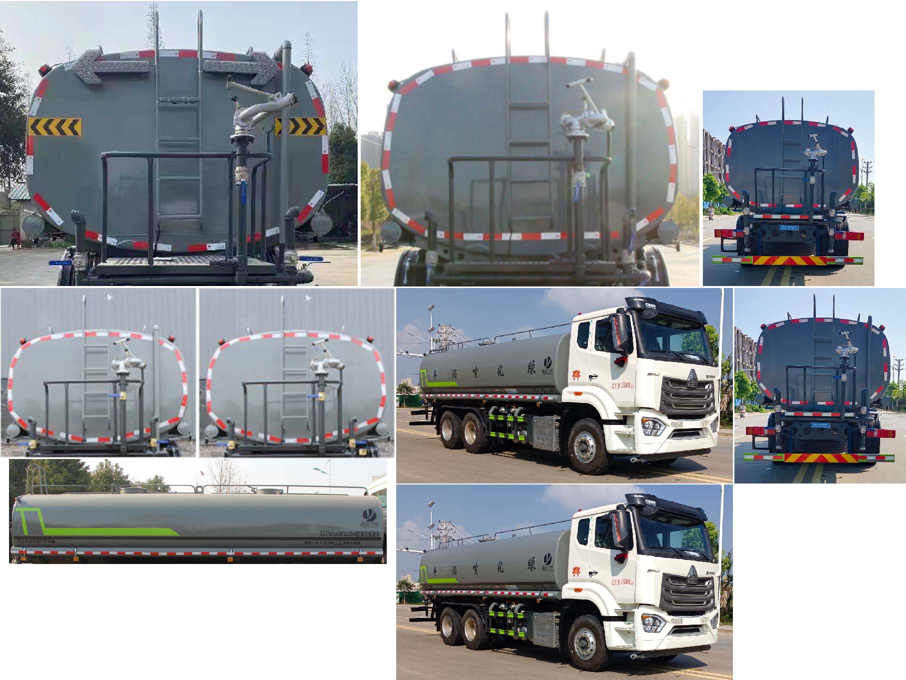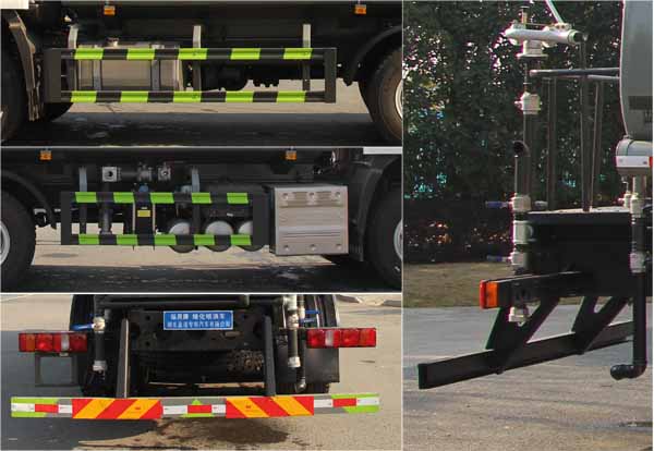 該車主要用于城鄉園林綠化噴灑;主要裝置為罐體及噴灑裝置;罐體總容量:14.81立方米;罐體有效容積:14.11立方米;罐體外形尺寸(長×長軸×短軸)(mm):6800×2390×1620;側、后防護材料均為:Q235,連接方式均為:螺栓連接,后部防護截面尺寸(mm):120×50,后部防護離地高度(mm):490;ABS型號:446 004 6300;ABS生產企業:采埃孚商用車系統(青島)有限公司.選裝EBS,EBS系統控制器生產企業:采埃孚商用車系統(青島)有限公司司,型號:EBS3.隨底盤選裝限速裝置;限速裝置限速(km/h):89;僅采用4325+1350mm軸距改裝.隨底盤選裝駕駛室,選裝噴霧裝置樣式;選裝水炮支架位置,選裝弧形噴灑裝置,選裝箭頭燈裝置,選裝不帶箭頭燈裝置選裝自動球閥安裝位置,選裝擋泥板樣式.選裝罐體頂部無高位花灑裝置,選裝后部樣式。選裝前部電子炮樣式,安裝電子炮時整車長為10750mm,前伸500mm。