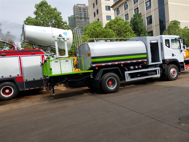 前噴后灑,前裝有鴨形噴嘴或圓頭沖嘴,后面裝有圓柱開(kāi)灑水噴嘴或蓮蓬頭噴嘴,后部有一工作平臺(tái),裝配有高壓水炮。后部還可裝8個(gè)噴嘴(選裝)噴水器一般用于沖洗街道。