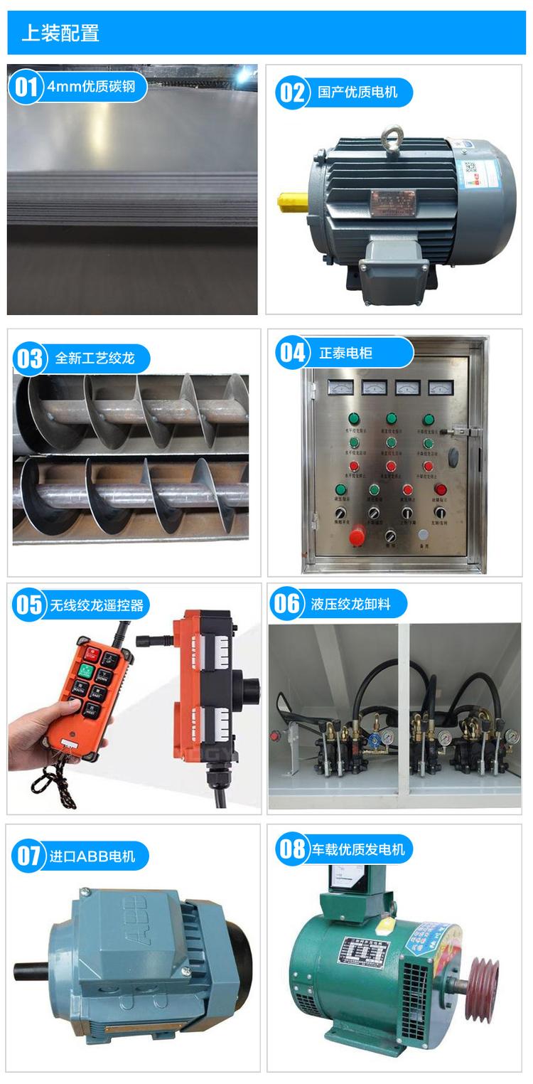 散裝飼料車有整車式和獨立罐式(可用相應載貨車運輸)等。按驅動形式分有:電動卸料散裝飼料車、全液壓卸料散裝飼料車。