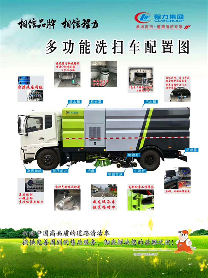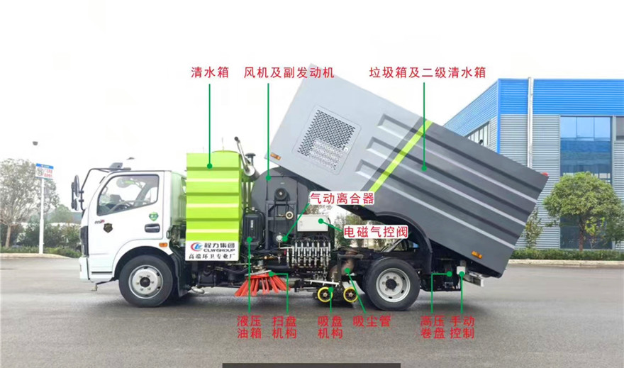東風(fēng)8方洗掃車采用東風(fēng)型國(guó)五二類底盤改裝,加裝副發(fā)動(dòng)機(jī)、風(fēng)機(jī)、高壓水泵、清水箱、垃圾箱、左右立掃、帶噴水桿的寬吸嘴、低壓沖洗系統(tǒng)、垃圾箱自潔,掃盤降塵系統(tǒng),液壓系統(tǒng)、專用裝置電控系統(tǒng)和副車架等改裝而成:
