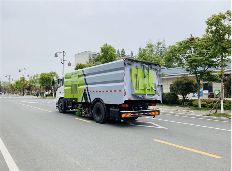 Ø 洗掃車采用東風天錦DFH1180EX8型國六二類汽車底盤改裝,加裝副發動機、風機、高壓水泵、清水箱、垃圾箱、左右立掃、帶噴水桿的寬吸嘴、低壓沖洗系統、掃盤降塵系統、液壓系統、專用裝置電控系統和副車架等改裝而成。
