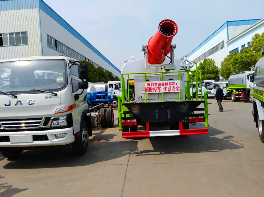 上裝配置:罐體采用武鋼5mm厚優質碳鋼鋼板,內置防浪板,避免車輛急剎時液體前涌造成的安全隱患,罐體頂部開有人孔。人孔既可以作為工作人員進行罐內檢修的進出口,也可以作為加水孔用于向罐內加注水,泵進泵出,消防栓接口,前沖、后灑、側噴、后工作平臺帶綠化水炮,垂直吸程≧7米,灑水寬度≧14米,射程≧28米,引水時間<5min,流量90m3/h。自流閥、濾網、帶自吸自排功能。兩根等長輸水管,金屬漆,其余標配。可選裝霧炮機灑水車:30米、40米、50米、60米、70米、80米、100米、120米等以上的霧炮機。