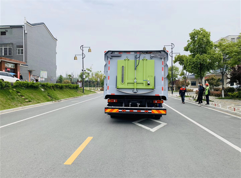 東風18噸洗掃車,帶2個中置掃盤,天錦為康明斯170馬力副發動機;三洋馬達;高壓水泵(前沖/側噴/中噴/后噴霧/沖洗水槍/垃圾箱自潔裝置);高壓路沿清洗噴頭,低壓泵(前沖);不銹鋼垃圾箱;控制器;控制箱;PLC一鍵控制;尾部LED箭頭燈;垃圾箱、水箱均帶防溢低水位報警裝置;倒車及洗掃狀態室內監視器。20m高壓沖洗卷盤。