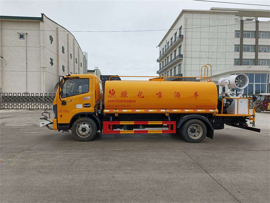 我公司產品灑水車標配前噴(鴨嘴)、后沖、后灑、側噴、后置式工作 平臺,平臺上配置綠化水炮(可 360°旋轉,既可以調成柱狀,也可 以調成霧狀,更可以調成直沖狀、大雨、中雨、小雨、毛毛雨),配 備優質大功率專用灑水泵(可自吸自排,可從河里或池塘抽水到罐體), 取力器,雜物過濾網,消防接口,自流球閥系統、取力器、球閥、濾網 均為國家標準產品,主管道加粗,法蘭墊、法蘭盤加厚,大通徑球閥。 整體具備性能優良安全可靠、效率高、流量大、維修方便等特點。
