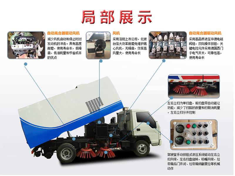 4、東風2噸小型掃路車采用中置4盤刷+后置吸盤的清掃結構,三段式工作,清掃效果更好。