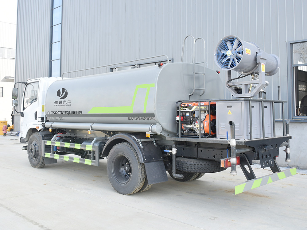 10方抑塵車產品主要技術參數 序號 名稱 型號、規格 1 整車型號 CLT5120TDYEQ6 型多功能抑塵車 2 發動機型號 D25TCIF1 3 發動機馬力/功率 云內 150 馬力/110KW 4 發動機排量 2499ML 5 變速箱 萬里揚 6 檔 6 輪胎規格 8.25 鋼絲胎 7 軸距 3800 8 總質量 11990KG 9 整備質量 5300KG 10 額定載質量 6495KG 11 整車尺寸(長×寬×高) 7.43*2.35*3.1 12 罐體容積 10 方 13 燃料種類 柴油 14 排放標準 國六 15 水泵型號 40/50 16 罐體材質 Q235 碳鋼